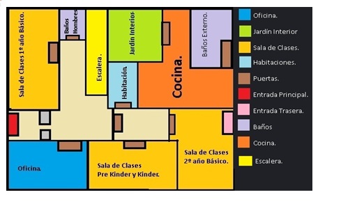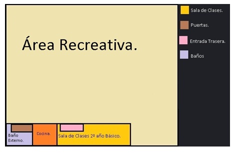 Sala de clases 2° Año Básico: La sala de clases presenta una gran debilidad frente a las demás, puesto que su puerta de entrada del patio trasero es utilizada para todos los alumnos. Además tiene una gran distribución de sus inmobiliarios, no estorban la movilización, ni el aspecto visual de los estudiantes, respecto al material didáctico que tiene consiste en Imágenes de representación como: abecedario, explicación de sumas y restas.