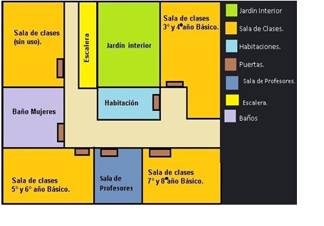 Sala de clases (sin uso): Esta sala a veces se utiliza para hacer clases a los educandos de 7° año Básico. Sólo cuenta con un pizarrón y en cuanto a sillas y mesas, los alumnos tienen que llevarlas de su sala de clases.